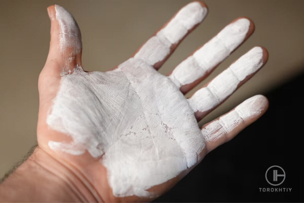 This particular quality “sticks” the substance to the hands and provides a long-term effect. Apart from that, some producers use more additives such as limestone, drying agents, and even essential oils to bring up new properties.