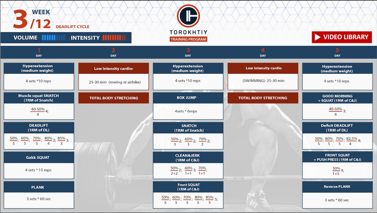 Deadlift training program is good for athletes who want to improve strength in DEADLIFT (develop the strength of their back and legs muscles). It includes a sufficient amount of accessory exercises for SNATCH and CLEAN&JERK, and one day for SNATCH and CLEAN&JERK are planned. Since the intensity in these exercises is low, they will not reduce the efficiency of training in DEADLIFT, but warm up the muscles, train the muscle memory and help to work out single technical elements.