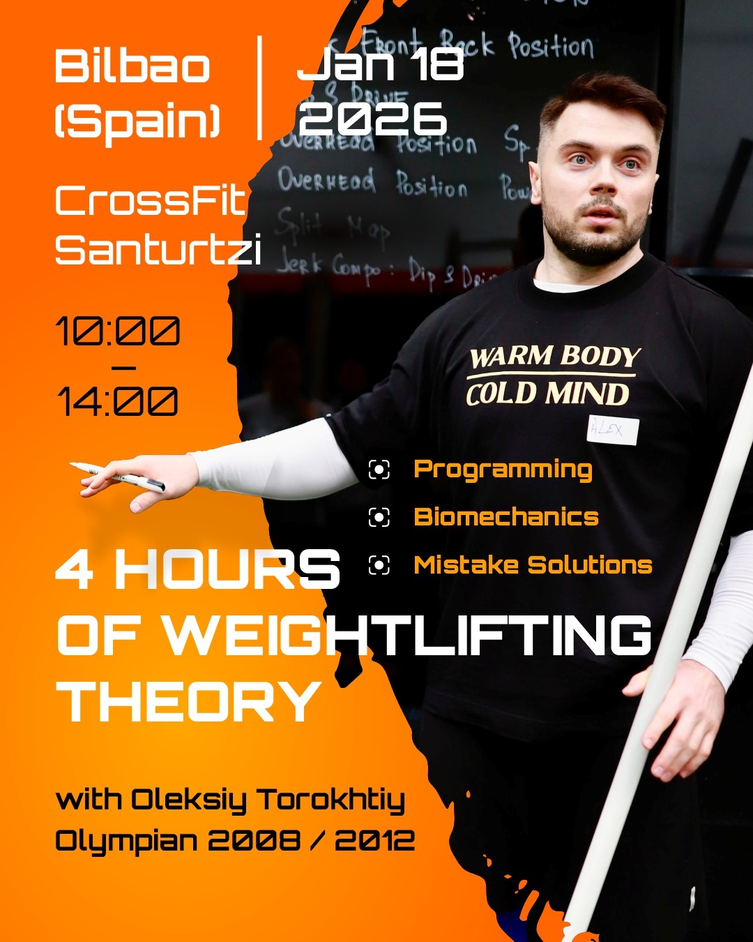Join two-time Olympian Oleksiy Torokhtiy in Bilbao for a 4-hour theory seminar where you’ll master programming, biomechanics, and mistake corrections, so every lift becomes smarter, safer, and more powerful.
